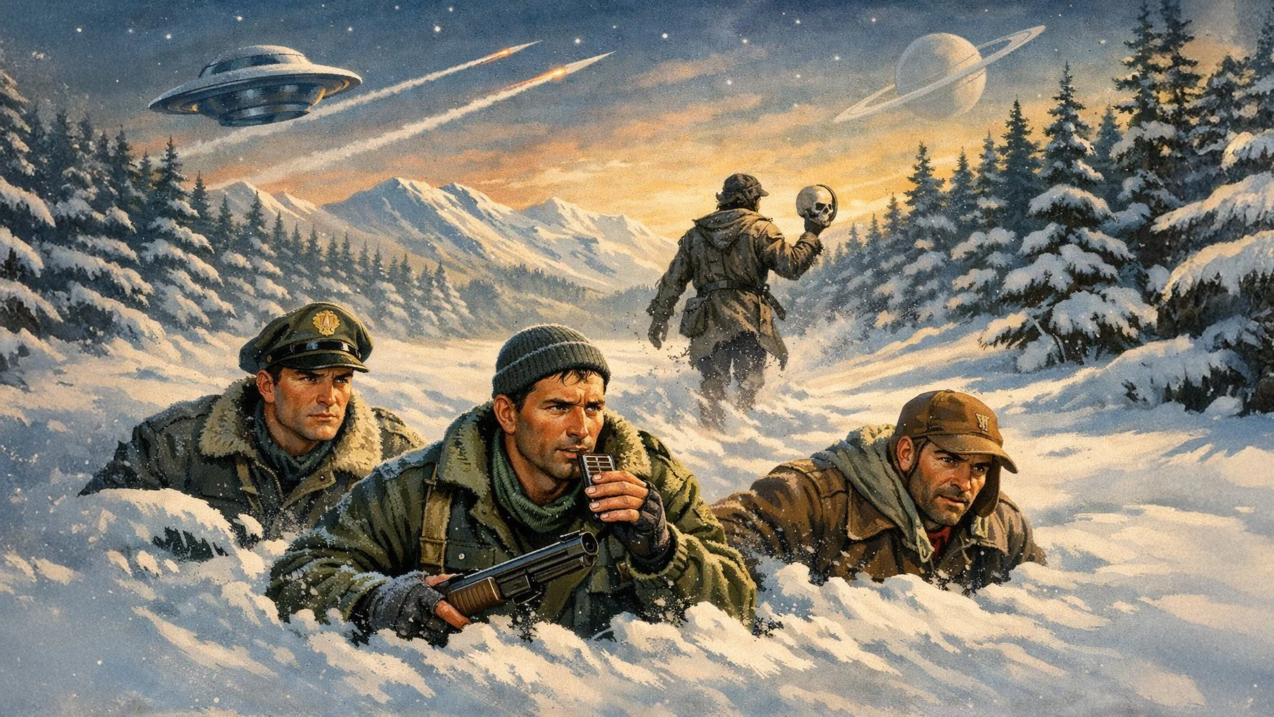 He was always up ahead, just beyond reach, a faint figure on the move, guiding them through the woods, away from the frozen lake where their plane had crashed nearly a week ago. In his hand was what looked like a skull, but you can’t really tell from this distance. He made his way swiftly and easily through the waist-deep snow, as if floating or swimming, not grinding his way barely, like the three survivors sent ahead in a race against the relentless clock. The three men, none of whom was injured, were best suited to make it to a town and hopefully get help for the other five back at the lake. There was Horn, the lieutenant, and the sergeants, Pru and Borg.