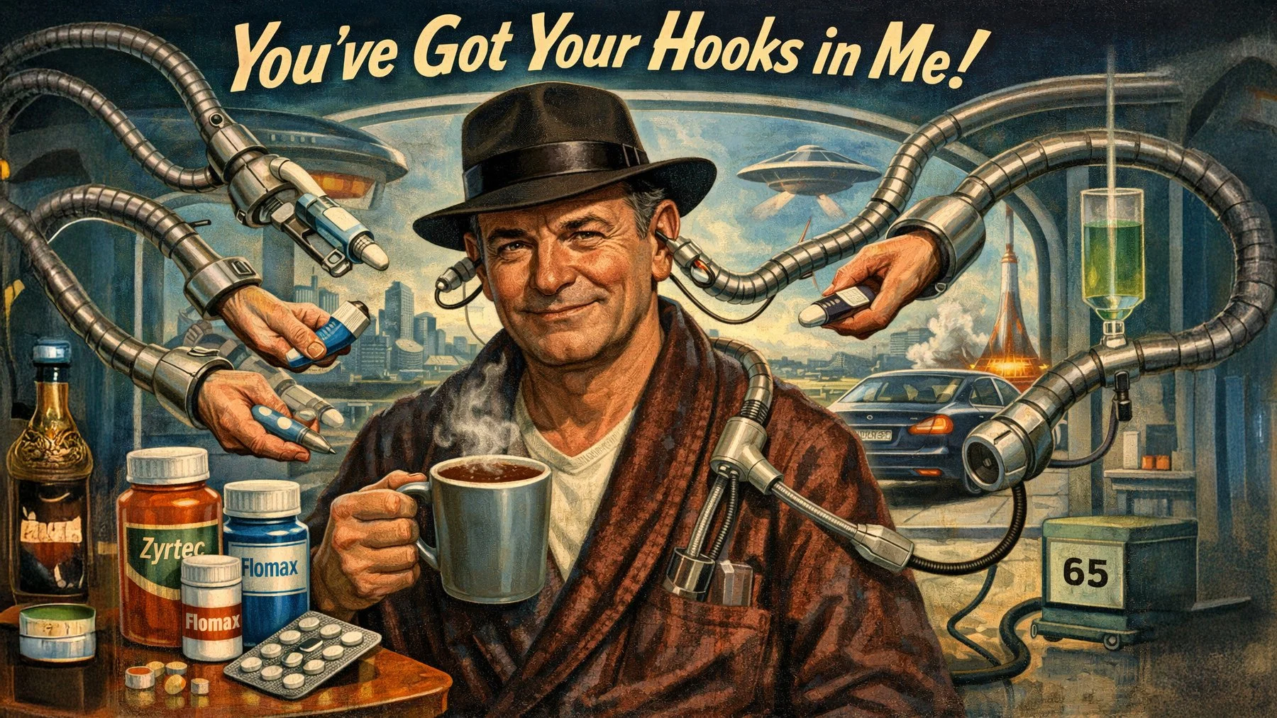 I don’t do drugs. I’d be bad for them. They’d be, like, whoa, will this trip ever end? I take drugs. That’s different. The day starts with two squirts of Flonase up each nostril. A shot of the disc inhaler. A levothyroxine tablet. If I miss any of those things, I get anxious. Not because I need them every time. Maybe I do, maybe I don’t. But I don’t want to take a chance. Late afternoon is rotuvastatin. That one, for whatever reason, I don’t stress if I run out. Montelukast. God forbid I miss that one. Zyrtec. And now Flomax, because my urologist scared the hell out of me with tales of spending my last decade hooked up to a catheter. Yeah. Fuck that. If I ever reach that point, I’m heading straight for the garage to gas myself. Unless I’m driving a Tesla. This is why electric cars suck.