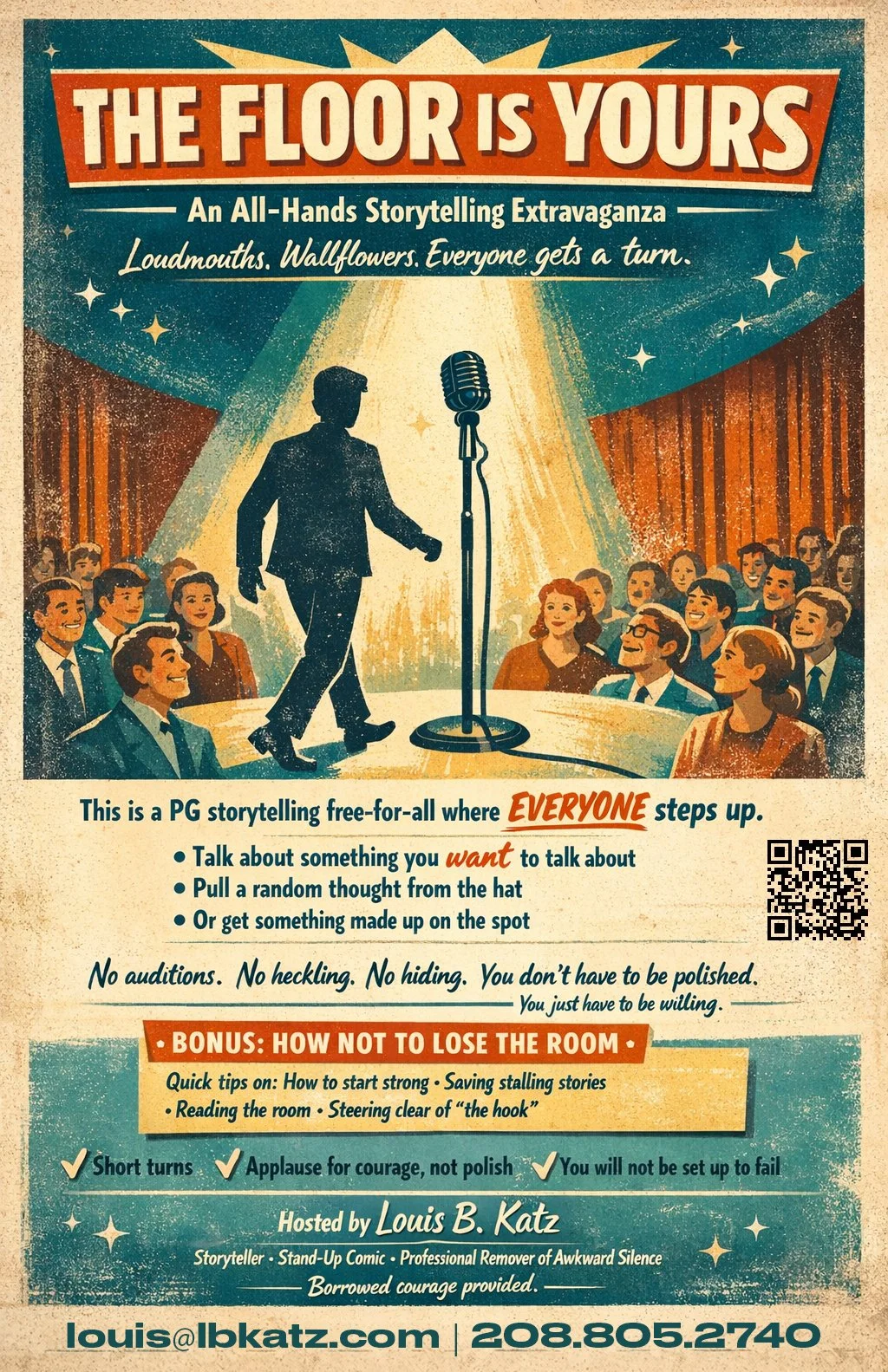 Yes, I love the limelight. All that attention can be intoxicating. But I’m willing to share. In The Floor is Yours, you get to tell stories, too! Loudmouths, wallflowers, everyone gets a turn. Talk about something you want to talk about, or pull a random thought from the hat. The goal is to have fun, loosen up, and get over that voice telling you “I can’t do this.” Because, guess what, you can.
